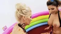 As the two seductive blondes and brunettes slowly emerge from the warm summer sun, their tanned, flawless skin glistening with a healthy sheen, they eagerly approach the large, vibrant red inflatable pool that awaits them.The womens laughter echoes in the background as they playfully toss around a pair of water guns, soaking each other and their already wet clothing before diving into the cool, refreshing waters.Inside the inflatable pool, the ladies take a break from their mischievous antics and decide to engage in an intimate moment together.They passionately kiss each other deeply, allowing their hands to roam freely over one anothers damp bodies.The brunette gently cups her companions face as they gaze into each others eyes, reflecting the depth of their connection.Their desires begin to grow, fueled by a shared desire for more intense pleasure.The blonde moves her hand slowly between the brunettes thighs, teasingly stroking her womanhood through the soaked fabric.The brunettes moans fill the air as she becomes more aroused, her own fingers reaching down to join in the seductive dance.The brunette starts to lick and suck on the blondes tender nipples, causing chills to race down her spine as the sensation intensifies.In response, the blonde brings her face closer, their lips meeting in another passionate embrace as she begins to taste the brunettes womanly nectar that seeped through her drenched underwear.As the ladies continue their carnal exploration of each others bodies, they exchange sultry glances and naughty secrets, heightening the intensity of their pleasurefilled afternoon.The blonde uses her fingers to spread the brunettes labia, expertly locating her sensitive clit as she begins to skillfully flick it with her tongue in a frenzied rhythm.The brunette gasps and writhes under the blondes attention, her climax growing nearer by the second.As they both reach their peak, the women release cries of blissful ecstasy that resonate throughout the pool area.Their orgasms intertwined, they collapse onto each other in a tangle of wet hair, tangled limbs, and quivering bodies.Once the passionate storm has calmed, the two women catch their breath and laugh together as they lay intertwined in the water.With their playful spirits rekindled, the ladies resume their tomato saucefilled adventure, drenching themselves once again in each others presence.